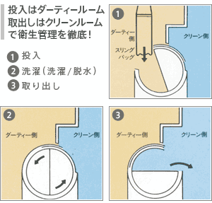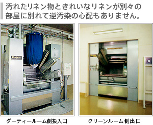 大口ドラムの振動によるモミ洗いと回転による強力なタタキ洗いで、一段と強力な洗浄力を確保した連続洗濯装置。 肌に優しいイオン交換水を使用し、イオン水貯水用タンクも72トンで病院寝具リネン業界全国最大級です。 |